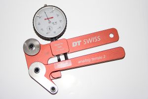 Royal Spokes baut sämtliche Laufradtype in mehreren Schritten auf. Zunächst wird das Laufrad auf „halbe Speichenspannung“ gebracht und erstmals kurz „abgedrückt“. Danach folgt in einem weiteren Schritt die endgültige Speichenspannung. Hierbei wird das Rad 4-5 weitere Male abgedrückt und notfalls nach jedem Abdrücken nachzentriert. Nach diesem Prozess sollte das Laufrad komplett stabil sein. Zum messen der Speichenspannung wird das DT Swiss tensio 2 verwendet. Jedes Laufrad wird von Royal Spokes nach der Fertigung anschließend verifiziert, ein individuelles Messprotokoll aller Daten erstellt und zusammen mit der Auslieferung des Rades euch übergeben. Erfasst wird die Axial-Toleranz (mm) sowie die Horizontal- und Vertikal-Toleranz (mm). Weiterhin wird das Messergebnis jeder einzelnen Speichenspannung (Nm) ermittelt und die daraus folgende Speichentoleranz (%) berechnet. Abhängig von der Art der verwendeten Felge gibt Royal Spokes seine Laufräder mit horizontal Toleranzen von maximal +/- 0,08 mm, vertikal Toleranzen von maximal +/- 0,15 mm, sowie einer Axial-Toleranz < 0,25 mm heraus.